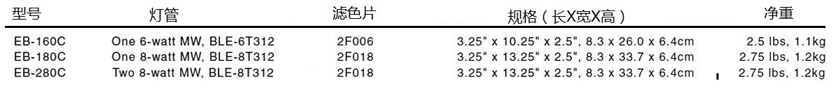 长波, LW (UV-A, 365nm) ♦固有自滤色灯管 (BLB)或非滤色灯管 (BL) ♦可选择配置滤色片 (FA) |