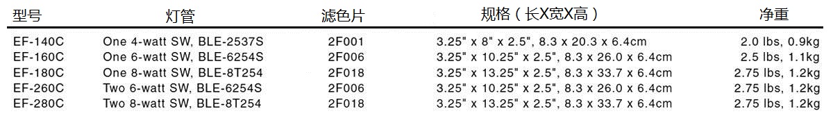 ♦非滤色长中短波灯管 ♦配置 LONGLIFE™ 滤色片 (FA)